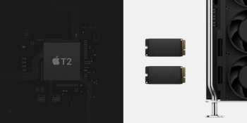 В Mac Pro нельзя устанавливать жёсткие диски (помимо внешних, конечно) — архитектура хранилища данных полагается на SSD-накопители с максимальным общим объёмом до 4 Тбайт. За шифрование данных отвечает особый сопроцессор безопасности Apple T2, гарантирующий запуск лишь доверенного ПО даже на самом низком уровне.