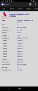 Qualcomm Snapdragon 855: восемь ядер (1 × Kryo 485 Gold, частота 2,84 ГГц + 3 × Kryo 485 Gold, частота 2,42 ГГц + 4 × Kryo 485 Silver, частота 1,8 ГГц)