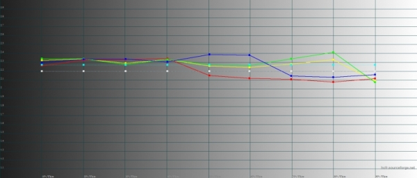 Я измерил цветопередачу Xiaomi Mi MIX 3 в «стандартном» режиме контрастности, который и предлагаю рассматривать как основной, несмотря на то, что по умолчанию выставлен адаптивный режим. Среднее значение гаммы в стандартном режиме составляет 2,27 при очень ровных кривых оттенков. Цветовая температура держится близ эталонного значения (6 500 К). Картинка умеренно-теплая, с очень приятным тонированием. Среднее отклонение DeltaE по расширенной палитре Color Checker (оттенки серого + широкий набор цветовых оттенков) составляет 3,23 при норме 3,00 и эталоне 2,00. Легкое отклонение есть (можно заметить, что цветовое пространство смещено относительно нормы sRGB), но совсем некритичное. Стоит признать настройку дисплея качественной – он способен отображать картинку честно, пусть и не в режиме работы по умолчанию.