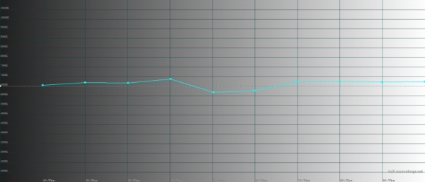 Xiaomi Mi MIX 3, цветовая температура. Голубая линия – показатели Mi MIX 3, пунктирная – эталонная температура